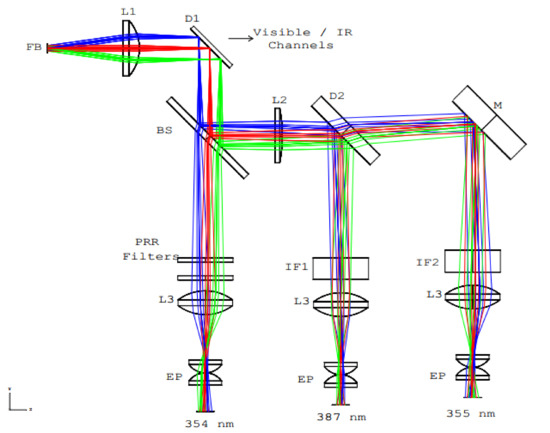Using a first dichroic beam splitter (D1) UV and Visible-IR branches of the collected backscattered radiation are divided. After the first reflection on D1, the UV portion of the spectrum is divided into three channels. The first 50/50 beam splitter (BS) divides the incoming light into equal portions. Lens L2 corrects the divergence of the rays for the channels at 354.76 and 386.7 nm (N2 VRR spectra center wavelength). D2 reflects high UV wavelengths of the incoming radiation, redirecting this portion of the spectra to the 386.7 nm channel, and transmits the low UV wavelengths, which is reflected by a mirror (M) to the 355-nm channel. Lenses L3 and eye-pieces (EP) are used to, respectively, collimate and equally spread the radiation on the surface of the photomultiplier tube (PMT) detectors.