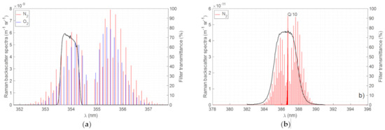 (a) N2 and O2 pure rotational Raman spectra (left axis) and filter transmittance (right axis) (b) N2 vibro-rotational Raman spectrum (left axis) and filter transmittance (right axis). The spectra shown correspond to a 300 K temperature and to a 1013 hPa pressure.