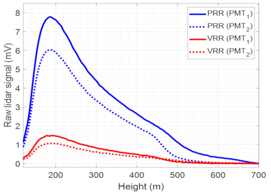 Finally, to consider a possible gain difference between the detectors, measurements with each PMT in its nominal position and with the PMTs swapped were made. In nominal conditions, PMT1 and PMT2 are the PMTs of the PRR and VRR channels, respectively. In the first measurement (nominal), PMT1 detected the signal of the PRR channel and PMT2 of the VRR one. In the second measurement (permuted), PMT2 detected the signal of the PRR channel and PMT1 of the VRR one. The background-subtracted lidar signals are shown in Figure 4. For the same channel, PMT1 gives a higher signal than PMT2 and thus has a higher gain. The PMT gain ratio, ΓPMT, was calculated by dividing the signals PMT1 over PMT2 averaged in the range [120, 700 m] for both PRR and VRR channels and taking the mean value of both ratios. We find ΓPMT = 1.32.