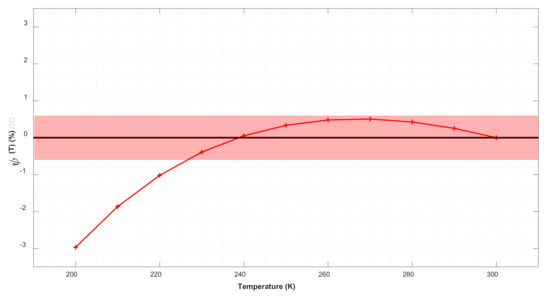 The results, shown in Figure 5, demonstrate that the relative variation of EDCSPRR(T) due to temperature does not exceed 3% in the 300 K–200 K temperature range and are even smaller than 0.5% for 230 < T < 300 K, i.e., below 10 km altitude.