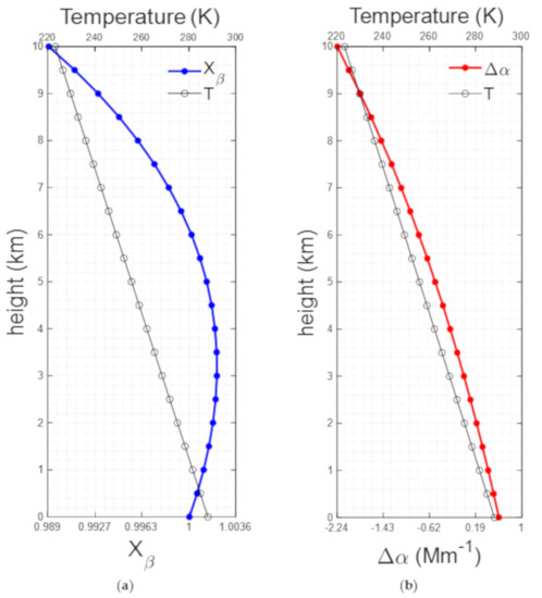 Temperature-induced variation for the backscatter coefficient can be estimated by computing the temperature height variation of σeff (z)/σeff (z0) (henceforth identified as Xβ) in Equation (4), reference height z0 was chosen to be 0 km. Temperature-induced error for the extinction coefficient was computed by the temperature height variation of the term (½)(d/dz)ln[σeff (z)] (henceforth identified as Δα) in Equation (5). For both calculations the temperature range was 288.15 to 223.25 K corresponding to a height range of 0 to 10 km according to the U.S. Standard Atmosphere model [19]. Results are shown in Figure 6. These computations show a temperature-induced variation for Xβ that does not exceed 1%. For the extinction, the absolute error variation is less than 1 Mm−1.