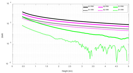 The enhancement factor may be calculated as: SNRPRR/SNRVRR = {(μPRR/μVRR) × (PqVRR/PqPRR)}1/2. Considering that detectors from both channels are almost the same, the second term may be neglected. Therefore, the enhancement factor is proportional to the square root of the averaged signals ratio as SNRPRR/SNRVRR = (μPRR/μVRR)1/2. In a 1 to 3 km interval the computed square root of the averaged signal ratios is 2.54 and 2.53 for both N1 and N2 cases. These values work in accordance with the previously estimated enhancement factors of 2.8 and 2.6, differing less than 10% and 5% respectively.