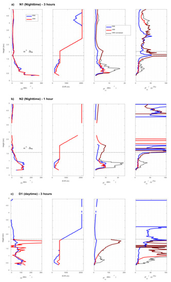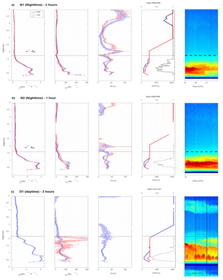 The relative uncertainty σαaer/αaer is also generally smaller for the PRR retrieval than for the normalized VRR one (Figure 9), although they can also exhibit similar values (e.g., range 2.4–3.2 km in case N1). In cases N1 and N2, below 1.5 km, σαaer/αaer for the PRR (and normalized VRR) retrievals are roughly constant and equal to 7 (14) and 8% (17)%, respectively. Above 1.5 km the relative uncertainty increases for both retrievals.