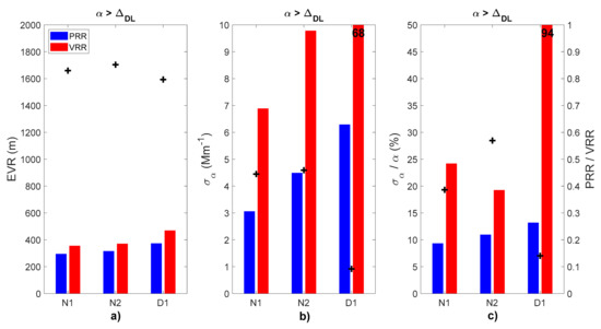 Comparative histograms of layer-mean values of the (a) vertical resolution, (b) absolute uncertainty and (c) relative uncertainty in the main surface aerosol layer (αaer > ΔDL) retrieved by the SCC from PRR and VRR signals for cases N1, N2 and D1. Black plus signs (right axis) are the ratio PRR to VRR. For layer-mean values exceeding the selected vertical scale the numerical value is reported in black on the top of the bar.