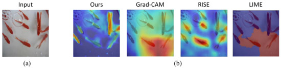 Saliency maps of four explanation methods, the proposed method, Grad-CAM [11], RISE [9], and LIME [10]: (a) an input image labeled goldfish, (b) explanations that are represented by the pixel-wise multiplication of the input and the saliency maps. The saliency map developed by the proposed method highlights almost all the fishes in the image, whereas the saliency maps of other methods are either blurred or indicate only some of the fishes.