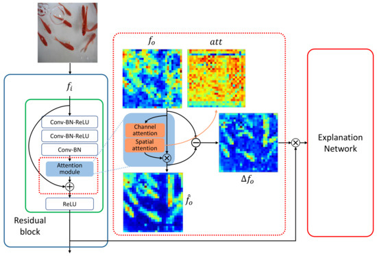 The structure of the attentive student network that consists of multiple residual blocks. Conv, BN, and ReLU stand for a convolution layer, a batch normalization layer, and a rectified linear unit, respectively. An attention module is plugged into a residual block to deliver the attentive features, , for the target network prediction to the explanation network.