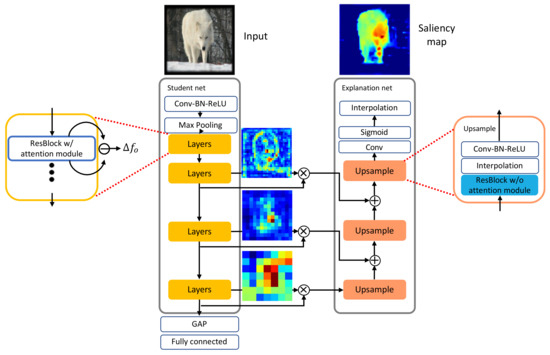 The surrogate networks of the proposed method comprise two network branches to solve Equation (1): an attentive student network () with parameters and an explanation network () with parameters as shown in Figure 2. encodes the knowledge of using attention to better learn the features of . We train using the knowledge distillation. Another branch generates a saliency map by exploiting the attentive features transferred from . The attention modules in enable to learn the meaningful intermediate features of that are expected to contribute to the output score of , whereas irrelevant or negative features are likely to be suppressed. takes the information of that are learned by as the input and generates the final saliency map. In such a way, the surrogate networks can be viewed as an autoencoder, where and are an encoder and a decoder, respectively.