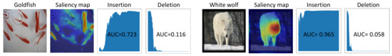 Quantitative Metrics. Although it is difficult to quantify the fidelity of a saliency map in general, we used two metrics to evaluate the pixel-level relevancy of a given saliency map: deletion and insertion [9]. This quantitative evaluation corresponds to the answer to the first question raised in the beginning of this section. The deletion quantifies the accuracy of finding the smallest susceptive region of an image that is the minimum area to change the model’s prediction when the region is altered. On the other hand, the insertion corresponds to the smallest evidential region that is the part of an image to be preserved to maintain the model prediction. The sole use of deletion is discouraged because, for instance, two extreme cases of the accurate and completely wrong smallest susceptive regions may have an identical deletion score. We therefore used the deletion and insertion metrics to evaluate saliency maps. A higher score results in better insertion, whereas a lower score is preferred for better deletion. In particular, the deletion score prefers a sharp drop when we consider the probability using a function of portion of removed pixels [9], whereas the insertion score is a complementary approach. Figure 5 shows illustrative examples of calculating the metrics.