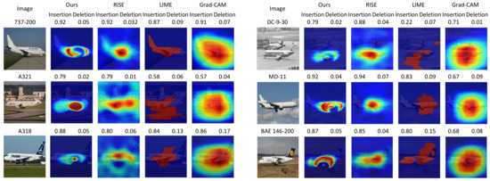 Comparisons of saliency maps from the proposed method to those from RISE [9], LIME [10], and Grad-CAM [11] for FGVC-Aircraft [31] variant. (Best viewed under magnification).