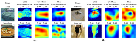 We provide a set of visualizations that qualitatively validate the proposed method for the four datasets as shown in Figure 6, Figure 7, Figure 8 and Figure 9. The results demonstrate that the saliency maps that were generated by the proposed method are sparser than those of other methods, and result in faithfully depicting the target object, whereas the results of other methods are blurred and often diffused over the entire region of the image. This capability of representing the target object effectively indicate the core regional clues corresponding to the model prediction. Moreover, the fine-grained characteristics of our saliency maps render them more visually plausible than that of other methods.