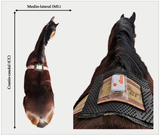 Each horse was equipped with an IMU (SHIMMER, Shimmer Research, Dublin, Ireland), placed on the withers. The sensor was fitted using a custom-built attachment via a standard surcingle (Figure 1.). The IMU was configured to stream tri-axial low noise accelerometer (±2 g), wide range accelerometer (±16 g), gyroscope (±2000 °/s) and magnometer (±1.3 Ga) data. Data were collected at a sampling rate of 102.4 Hz using the SD log firmware and configuration settings which were set in the ConsensysPROTM (v1.0.0) software (SHIMMER, Shimmer Research, Dublin, Ireland). Similarly, data were imported and downloaded for offline analysis using the ConsensysPROTM application.