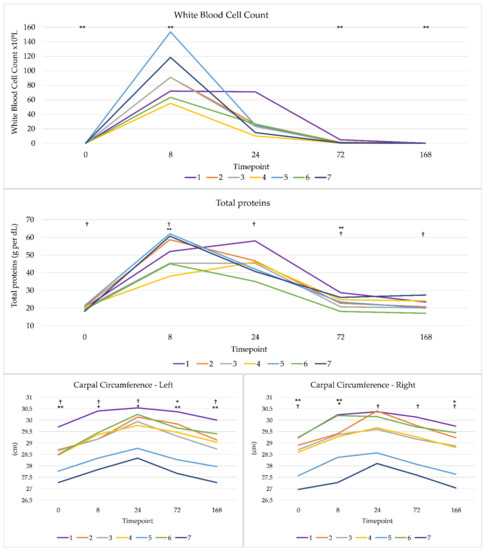 Inflammation markers. White blood cell count, total proteins, and carpal circumference across the 7 horses, * denotes p ≤ 0.05, ** denotes p ≤ 0.005 and † p ≤ 0.001. See Section 3.2 for list of significances across timepoints.