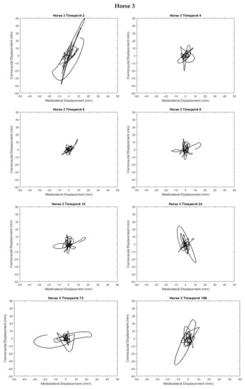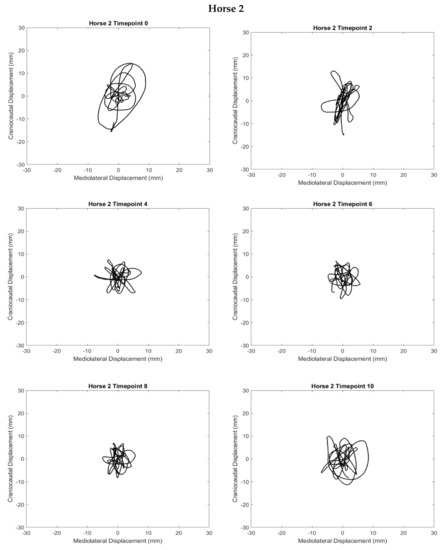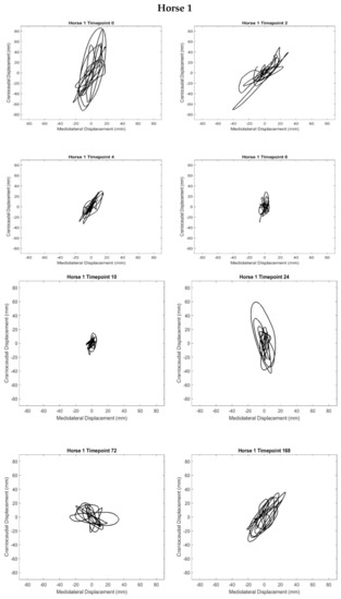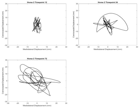 Postural sway at the withers was visualised using stabilograms that show horizontal sway in CC and ML directions over a 60 s period. Stabilograms were produced for each horse for all available timepoints. Stabilograms for horses 1, 2, and 3 (Figure 7) are shown here with data for other subjects plotted in Supplementary File 1. Visual inspection of these stabilograms suggest that the naturally occurring variations in postural sway were constrained during the most inflamed period for all but one horse (H6) in this study.