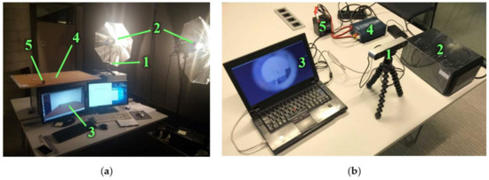 Test platform for real-time testing of sensing solutions: (a) laboratory test setup: 1—stereo camera with tripod; 2—light sources; 3—video output; 4—measurement area; 5—measured object; (b) measurement platform for field tests: 1—stereo camera with tripod; 2—NVIDIA Jetson TX2; 3—notebook computer; 4—12/220V inverter; 5—12-volt battery.