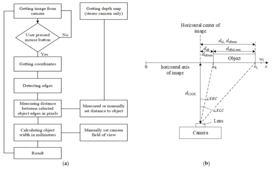 Object’s width measurement: (a) algorithm; (b) scheme.