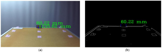 The user selects the object, whose width is measured with a blue cross using the computer mouse cursor. The distance from the camera to the object under the cursor is displayed next to the cursor if the depth image is available (Figure 3a). After a point is selected, a Canny edge detector is used to obtain the image edges, including the edges of the object (Figure 3b). After the edge detection, the vertical edges that are the closest to the selected measurement point are identified using the iterative algorithm, which scans the image horizontally on both sides of the selected point. All the tests were performed with the assumption that the measured surface of an object is parallel to the image sensor plane to simulate the lateral displacements of the object with respect to the camera.