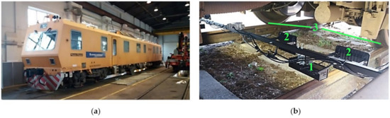 Measurement system installation: (a) railway geometry-measuring machine Plasser & Theurer EM-140; (b) mounted equipment: 1—stereo camera in a protective case; 2—artificial light sources; 3—measurement areas.