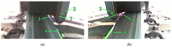 Real-time processing visualisation: (a) left wheel and rail; (b) right wheel and rail. In both: 1—detected wheel flange measurement point; 2—estimated rail edge point; 3—estimated wheel flange measurement point; 4—detected rail edge line.