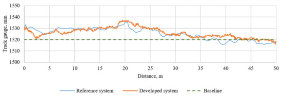 After the investigation conducted in the laboratory, the field test was performed, as described in Section 3.2. The field test was conducted on a railway with a 1520 mm track gauge, which is typical for Lithuanian Railways. The experiment was conducted on a sunny day. The initial tests were performed in the Vilnius railway station yard; the straight track section was selected for investigation, and the train velocity was about 10 km/h. It was an initial investigation to test hardware components such as the lighting, damper of the camera and power supply, and software components such as the data acquisition and data processing algorithms. It was necessary to define further steps to improve the system’s accuracy and reliability. The developed system was installed on the geometry-measuring machine the Plasser & Theurer EM-140 (Figure 5a,b and Figure 6); it allowed us to compare the data we measured with a reference. The reference system measures the gauge but not the wheel–rail lateral position directly, so we tuned our system to measure the gauge as well. The data from the Plasser & Theurer EM-140 were recorded every 25 cm, and they were velocity independent; the sample rate of our image system was 30 frames per second (FPS). In Figure 9, the measurement results for the conventional measurement system installed on the Plasser & Theurer EM-140 and the developed camera-based system are presented. To compare, the developed system measurements were resampled to be comparable to the measurements from the reference system, and the root mean square error (RMSE) between them was calculated, which was equal to 2.81 mm.
