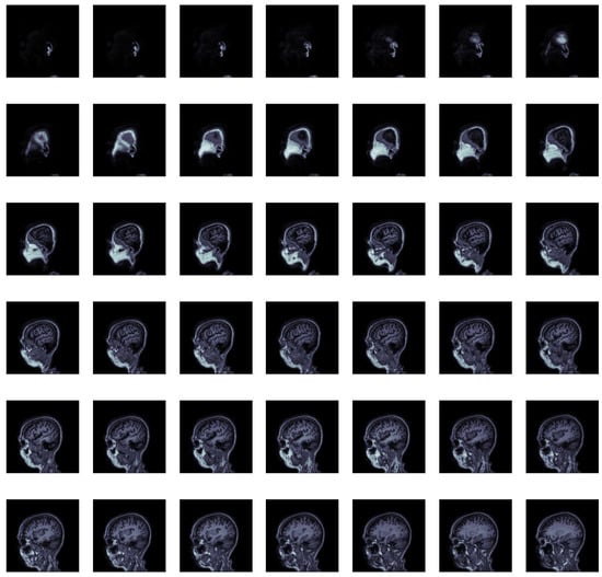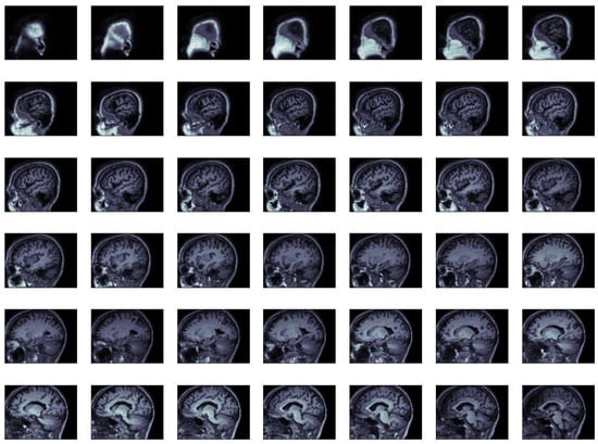 MRI data comprise groups of slices. We present in Figure 1 an extract of the MRI slides of a subject. The extract is not complete. We only show 42 slides out of 170. Each slice is an image, and the combination of images forms the MRI. All images or slices are a pixel matrix. Every slice has an associated spatial thickness because they reproduce reality. Furthermore, all pixels in each slice have a spacing, that is the space they represent. Consequently, the data are volumetric or rectangular cuboids.