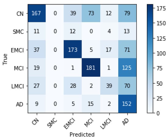 As the ability to differentiate between most classes improved, we noticed a decrease in the late mild cognitive impairment class’s performance metrics. We inferred that we advanced towards a local minimum solution that increased the other classes’ predictive power, but departed from the LMCI class’s accurate prediction. We believe that the need for class balance in the dataset is a possible cause of this observation. The LMCI is the class with the lowest number of instances (after the removal of SMC). The pitfall of class imbalance and the number of instances could potentially be addressed with data augmentation, as proposed in []. However, data augmentation would introduce a performance constraint and reduce the highest amount of epochs we can use during training. Data augmentation is a trade-off we decided not to make. Additional inspection of the LMCI prediction showed that many of the misclassified instances were labeled as AD. We can consider this a pessimistic behavior, and therefore, it was tolerated. Consequently, we accepted the final metrics and the compromise of not balancing the data through data augmentation because of the limitations imposed by Google Colaboratory.