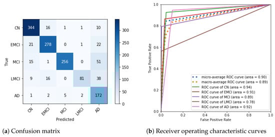 We obtained the confusion matrix in Figure 4a after dropping the SMC class and training to 80 epochs. In the matrix, we may see that the incorrect predictions are principally pessimistic. That is, there are more errors above the diagonal than under it. This arrangement of errors above the diagonal means that the classifier makes errors that predict the upper disease stages. This kind of error is clearly in favor of patients because a false positive is better than a false negative in diagnosing diseases. Figure 4b also shows that the area under each curve tends to 1.0; which demonstrates the classifier’s diagnostic ability. Notwithstanding the faults of our classifier, it is a valuable classifier. Next, we still improve this model.