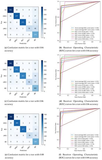 We also created new confusion matrices and ROC curve plots (Figure 5). When analyzing the newly obtained confusion matrices, we noticed a possible pattern (Figure 5a,c,e). In the AD prediction column, we see an ascending number of false AD as there is more disease progression. There is possibly a feature that is recognized as AD as the disease progresses. Healthy people possess this feature. These false AD predictions require further investigation. However, without investigation, we believe that the solution would be the brain segmentation we propose in Section 6.1.