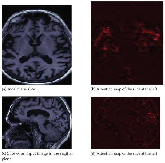 In the images in Figure 6, we can see how brain atrophy areas appear more prominent. We noticed this behavior in other images for which we produced attention maps. The behavior of the network was as expected in terms of identifying the regions of importance. However, we also noticed that sometimes the neural network gave importance to bony areas of the skull or even to areas outside the skull. In other words, the attention maps seemed to have a potential function as debugging tools. Besides, they allowed us to propose solutions. We believe that we must improve the preprocessing of images by removing the skull using a mask, as the skull is a potential source of noise. This background noise could explain some of the classifier’s inaccurate results, as observed in the confusion matrices. The neural network may be learning uninformative features or patterns as a result of excess inputs. We could improve the results and reduce the inaccurate results by providing the CNN with only brain images, thus removing potential artifacts associated with the skull.