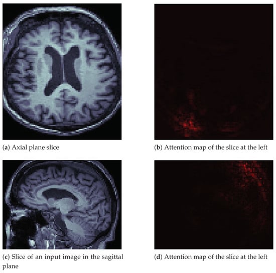 Attention maps are visual tools that explain deep convolutional neural networks []. We used the M3d-Cam tool [] with the Guided Gradient-weighted Class Activation Mapping (Grad-CAM) algorithm. We generated new images through M3d-CAM, and with these images, we could interpret what the neural network was emphasizing to make a decision. For example, in Figure 6a, we can see an image in the axial plane of a person with Alzheimer’s disease. We extracted only one slice of the cuboid. To its right, in Figure 6b, we can see that the neural network focuses its attention on brain atrophy. We extracted the same slice number from the attention map cuboid. In Figure 6c,d, we see the same patient and the same features in the sagittal plane. We also only extracted one slice of that plane.