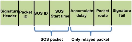 The propagation delay in the link of an incoming SOS packet from a node j is determined by the packet’s transmission time and the measured ToF. To significantly reduce the packet’s size, rather than including the transmission time as part of the packet, we obtain the information on the propagation time in the link from node j based on the SOS transmission time, the accumulated time delay, and the route passed by the packet as explained in the following.