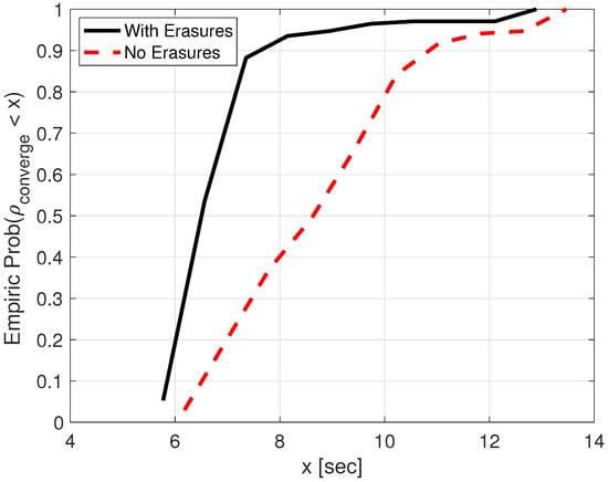 Empirical CDF of convergence time . The average result is 8.5 s and 10.4 s for using and not using erasure information, respectively.