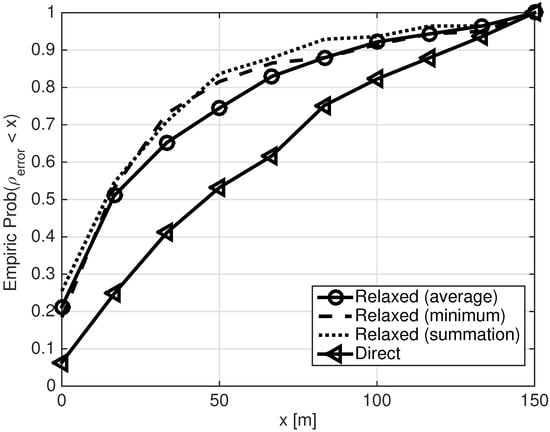 To comment on the proper way to localize the SOS source when set holds two nodes of estimated relative locations, in Figure 5, we show the CDF of for the solution of the direct optimization problem (1) (Direct), and for the solution of the relaxed optimization problem (2) (Relaxed) using the three rotation options described in Section 4.2.2. We conclude that the Relaxed solution is always better than the Direct one. This is because the performance of the Direct solution relies on the performance of the rotated MDS solution, which-as observed by the results of Figure 4—is, in fact, inaccurate. Comparing the three options to define (5a), we observe that the performance of the ‘Summation’ approach is far better than that of the ‘Average’ approach, and slightly better than the ‘Minimize’ approach. This is mainly because the ‘Summation’ approach accounts for all nodes in , and we used accurate relative locations of the nodes in .