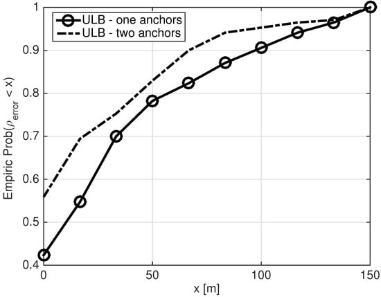 We now compare the performance of the ULB conditional localization method when set holds one or two nodes. The results are presented in Figure 6 in terms of the CDF of . As expected, the results improve when set includes two nodes, with an average gain of 11.3 m. However, this requires the assisting node to know its location, relative to two nodes, which is not always guaranteed. Still, observing the absolute Euclidean error, we conclude that the ULB method performs well and provides the localization capability of a diver in distress with sufficient accuracy when set includes only one node.