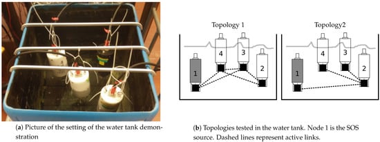 To test the feasibility of our algorithm with real hardware, we set up a proof-of-concept test in a water tank of size 60 × 70 cm. To reduce reverberations, the walls and floor of the tank were covered with sound-absorbing material. Using the T2Mo tool [], we accessed the physical layer of four EvoLogics modems to employ our algorithm. As is depicted in Figure 7a, the black modem was set as the SOS source. While the modems were stationed very close to each other, due to the strong interference in the tank, the formed network graph was sparse. In particular, as illustrated in Figure 7b, two topologies were tested, and five runs were performed for each topology.