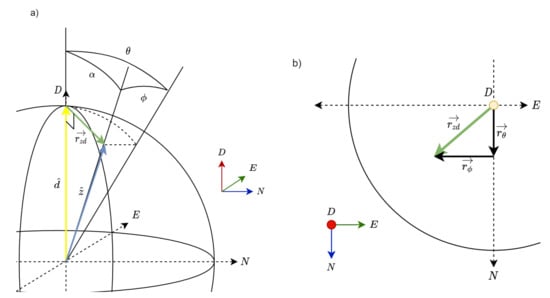 Geometrical representation of a buoy’s rotation in the roll and pitch dimensions of movement and vector approximation for small angles: (a) three-dimensional geometry sketch showing eigenangle , roll (), and pitch () angles and vectors  and  in an NED coordinate system.  transforms into  after the roll () and pitch () rotations about the N and E axes, respectively (Equation (12)). (b) Representation of roll and pitch rotations  and , respectively, on the NE plane (Equation (10)) along with the resultant vector  (Equation (14)).