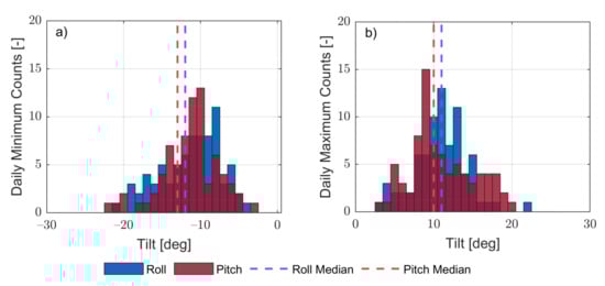 Histograms of the daily minimal and maximal roll and pitch inertial-measurement-unit (IMU) records (57,520,000 records between 29 Match and 17 June): (a) daily minimal tilt-record histogram and (b) daily maximal tilt-record histogram. The dashed lines represent roll (blue) and pitch (red) medians in both panels.