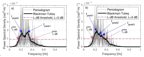 Figure 7 shows the buoy’s eigenangle PSD for two different motional cases. In both, it emerged that there was not a single relevant spectral component but multiple ones (labelled , blue arrows). In order to consider all relevant spectral components contributing power to the significant wave period, we defined an L-dB threshold (quantity “L” to be found) as the relative level L-dB below the maximal peak level of the PSD. This L-dB threshold (L = 3 dB in Figure 7) defines a frequency span, [,], in which the PSD content is higher than a power factor of  compared to the peak level. The L-dB method computes the wave period as the average wavelength in the L-dB region. We defined the average wavelength as the arithmetic mean between the maximal and minimal wavelengths:
