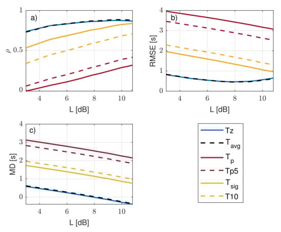 was estimated at  values ranging from 3 to 11 dB and compared against oceanographic wave-period definitions , , , , , , and  defined in Section 2 and measured by TriaxysTM, which were used as references. Figure 8 shows statistical indicators when comparing  as a function of L with each of these TriaxysTM reference periods. Figure 8 shows the results of these comparisons in terms of  (Figure 8a), RMSE (Figure 8b), and MD (Figure 8c). The zero-crossing and the average-period methods ( and , respectively) from the experiment yielded identical statistical indicators, which is evidenced by the overlapping blue and dashed black lines in the three subfigures (Figure 8a–c). When comparing  and  to , maximal , minimal RMSE, and MD closest to 0 were evidenced. The largest differences occurred for the wave energy spectrum peak methods ( and ). A possible explanation for that is that wave energy spectrum peak methods measured the period corresponding to the peak spectral component and did not consider wave multimodality. Lastly,  and , which consider the highest tenth and third of the wave energy spectrum as the relevant wave spectral components, respectively, showed better agreement than the latter set did ( and ), with  showing better indicators.  showed higher , lower RMSE, and MD closer to 0 than  due to the broader frequency span. It emerged that the L-dB method best matched  and  (with virtually identical indicators). In the following, the L-dB method is compared with reference to .