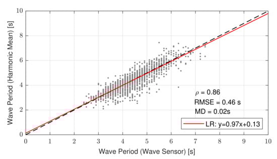 To carry out this comparison, three statistical indicators were used: (i) correlation coefficient (), (ii) root-mean-square error (RMSE), and (iii) mean deviation (MD). In the context of WE, a typical sampling period is 10 min; thus,  was estimated every 10 min. When comparing the significant wave period estimated via the L-dB method and TriaxysTM,  was resampled to the temporal resolution of TriaxysTM (1 h). Root-mean-square error is defined as