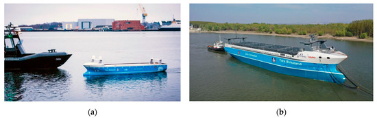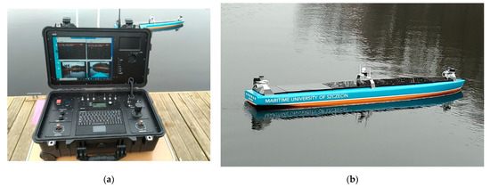 Figure 1. Model of the ship Yara Birkeland for research and testing (a) [9], and the autonomous container ship Yara Birkeland launched in February 2020 (b) [10] (120 TEU, L = 79.5 m, B = 14.8 m).