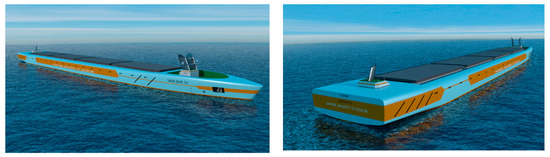 - Ship Yara Birkeland—designed since 2017 unmanned container ship (Norway) [9]. Figure 1 shows model tests in 2018.