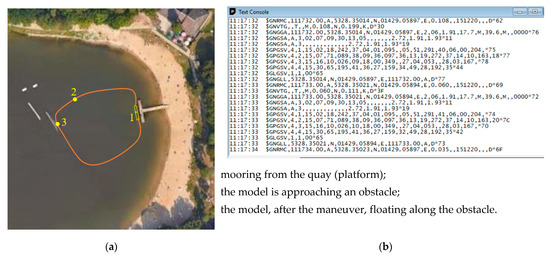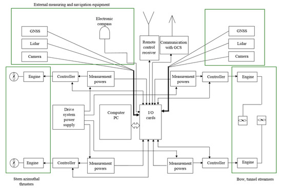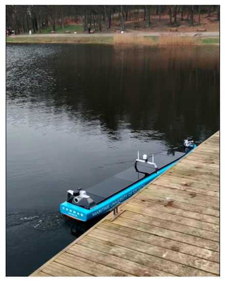 Subsequent publications [18,19,20,21] presented the results of computer simulation studies and experiments of autonomous ship models. The studies presented there concerned the detection of obstacles at sea by means of radar, lidar, sonar, or cameras and the determination of a safe navigation route. The configuration of the computer systems used, the technical parameters of these systems, and the measurement and navigation equipment were not included; neither are the methods of measurement data processing nor their registration and transmission to land-based centers monitoring the movement of the autonomous vessels presented.