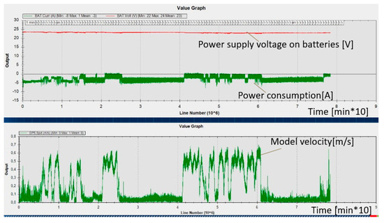 - Supply level too low: A two-stage action is provided. When the first level is exceeded, the I/O module will not allow a high-power task. When the second level is exceeded, the thrusters are stopped, but the system can be switched to manual mode and the thrusters can be forced to work manually until the batteries are completely discharged—this is an extreme emergency situation and destructive for the batteries, but in some situations, it must be possible to move the model ship away from a dangerous place, e.g., to avoid a collision. All values are configured in the I/O module. The operator can view these data in the GCS and is informed in advance when the critical values are approached.