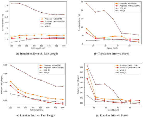 Interestingly, LSTMs reduced our accuracy in a counter-intuitive manner. While the LSTMs managed to model the relationships between RGB image pairs, they fail to do so when working with optical flow images. This could be due to the prevalence of temporal feature representations, since RGB image pairs use the same image twice when iterating through a sequence, which is missing when working with optical flow since optical flow is scene-invariant. Subsequent optical flows can differ, whereas the RGB frame at time t will be shared with both the frames at time and . Figure 4b,d indicates that using LSTMs helped at high speeds when there are large displacements between frames, and it is able to use sequential information to output an improved estimate. There are also limited samples in the dataset with the car driving at speeds greater than 50 or slower than 20. We believe more experimentation is required in assessing the role of LSTMs when working with optical flow feature representations.