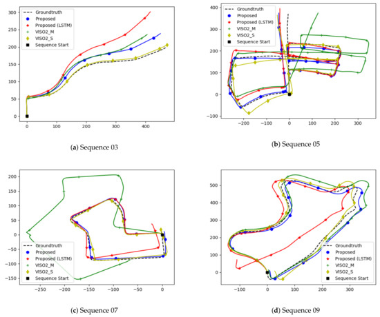 We evaluate our model on sequences 03, 05, 07, and 09 to realize the generalization of our network. The evaluation is based on the KITTI odometry benchmark [39]. Translation and rotation errors are calculated for sub-sequences of lengths ranging from 100 to 800 m every 100 m. Then, the averaged root-mean-squared error is considered. We compare our results vs. VISO2 [13] and MagicVO [25]. VISO2 is an open-source, feature-based solution for visual odometry. It minimizes re-projection errors between sparse feature matches and supports monocular and stereo-based configurations. We show comparisons against both configurations. MagicVO is a deep learning approach that augments FlownetS with bi-directional LSTMs. We chose to compare against MagicVO, as their results outperform other approaches in the literature, and thus they act as a good baseline. Since their implementation is not public, we compare against results published in their paper. We report our results in Table 2. We also draw a quantitative and qualitative comparison against VISO2. We show quantitative comparisons in Figure 4, and qualitative ones in Figure 5.