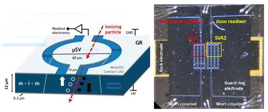 The scCVD diamond membrane consists of four arrays of 16 sensitive volumes interconnected with bridges and bonded on a DIL20 chip carrier. Structurally, it comprises an intrinsic diamond layer (12 m thickness) sandwiched between two layers of metallic aluminum electrodes. Further patterning of the top electrode and a chemical etching process were performed for the realization of multiple microsensitive volumes (SVs) surrounded by the guard ring structure, as shown in Figure 1 (left). The critical dimensions have been chosen for the best signal to noise ratio in measurement conditions. Detailed descriptions of the fabrication process of a guard-ring (GR) scCVD membrane microdosimeter and its charge transport characterization with an ion microbeam can be found in previous work [21].