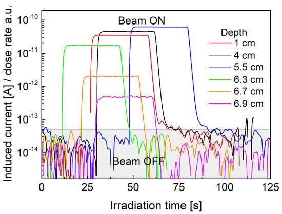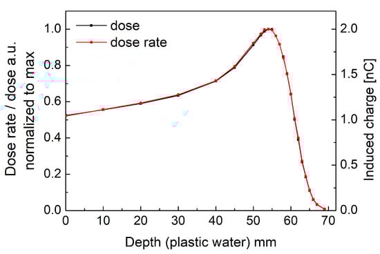 Figure 4 presents beam-induced current curves measured under 30 s irradiations at various depths of plastic water phantom. The plateaus of the presented curves corresponds to relative dose rate of used proton beam. A remarkably low leakage current (less than A) can be observed on the diamond sensor for beam-off conditions. The beam-induced charge was obtained by integrating the induced current over the irradiation window (the induced charge corresponds to relative absorbed dose). The maximum dose (induced charge) is obtained at 54 mm of plastic water depth marking the maximum peak of the depth dose profile. Comparison between dose rate, instantaneous induced current at the plateau level and dose integrated induced current curves (induced charge) within the irradiation time window is presented in Figure 5. It shows a perfect agreement between both quantities indicating the possibility of fast scanning in water phantoms if only constant beam current is guaranteed at the accelerator level.