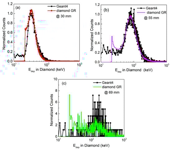 The energy loss spectra obtained from labZY MCA of the calibrated diamond GR microdosimeter is presented in Figure 6. Only three measurements, related to the characteristics points of the depth dose profile are shown; i.e., (a) at the plateau (30 mm), (b) at the Bragg peak (BP) maximum (55 mm depth) and (c) the distal end of the BP (69 mm).