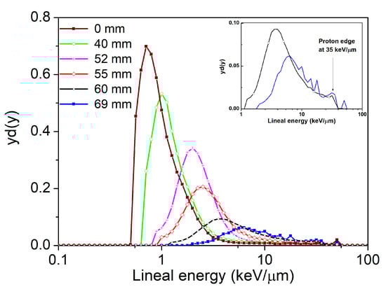 Experimental microdosimetric spectra obtained from a GR diamond microdosimeter in a plastic water phantom at depths of 0, 40, 52, 55, 60 and 69 mm. Inset: a zoom on the spectra at 60 and 69 mm. Proton edge at 35 keV/m corresponds to protons of 1.3 MeV with a stopping range of approximately 12 μm in diamond equal to the sensor thickness.