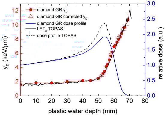 To further benchmark our experimental results of , we performed numerical simulations using TOPAS Simulation Toolkit [31] to obtain dose-weighted LET values. The complete Y1 beam line geometry (Figure 3) with a configuration identical to the experiment was implemented in the simulation. We used a water phantom placed in the isocenter to obtain dose and LET profiles. The TOPAS ProtonLET scorer gives the LET of primary and secondary protons, including the energy deposited by associated secondary electrons. More details about LET scoring technique in TOPAS/Geant4 can be found in [32,33]. The TOPAS-simulated LET profile is displayed in Figure 8 (in black solid line); it is in close agreement with the experimentally measured profile for all depths. Frequently, due to the fundamental difference between LET and , literature-reported comparisons between both differ, especially in the entrance part of the BP [28]. In general, this difference arises from the different volumes (voxels) used for LET calculation (typically ≈ 1 mm) and measurement (typically ≈ dozens of microns) and is related to the energy transfer differences by the delta-rays. Both quantities frequently differ at entrance part of the BP where delta-rays have higher range, exceeding the volume of interest used in measurement. In the distal part, the delta-rays’ range becomes comparable with the volume of interest used in measurement; thus, both values are in close agreement. In our case, volumes in simulation (0.05 mm) and measurement (≈39 microns water-equivalent) were comparable, resulting in close agreement of and LET in the whole range. A comprehensive review of volume size influence on LET calculations can be found in [30].
